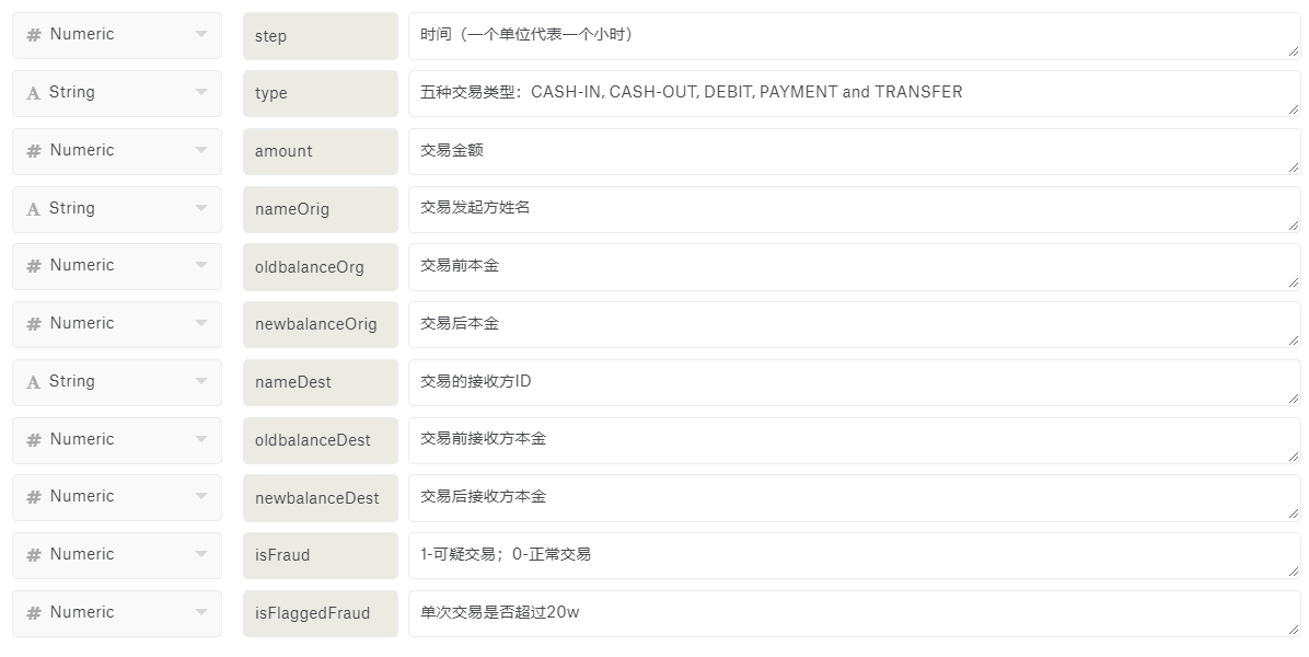 我们使用的数据集来自kaggle,大小为470M,6,362,620个样本和11个变量(含响应变量)。所包含的变量,类型和描述参见图1.1。我们将抽样100w行来完成模型的学习。