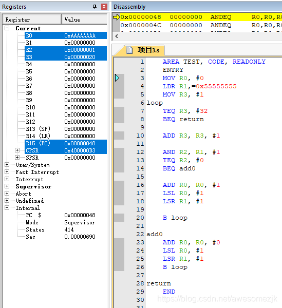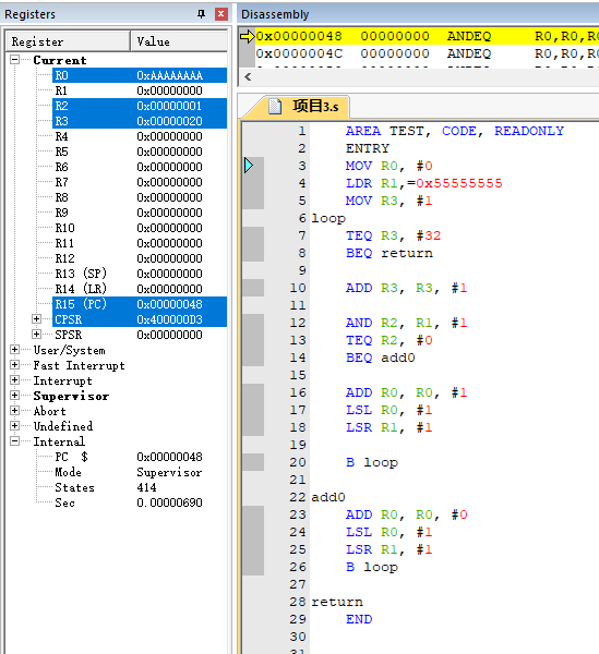 AREA TEST, CODE, READONLY ENTRYMOV R0, #0 ;R0清零LDR R1,=0x55555555 ;这里我直接把R1的值赋成要换位的数了 为啥要这么赋值是因为这是一个不合法的立即数,不能用MOV来赋值,只能用伪指令来做,大概是这样,我只模糊地记得老师大概是这么说的MOV R3, #1 ;R3用来做计数器