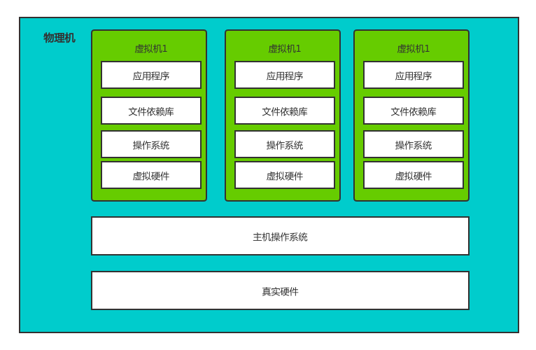 最早的做法就是通过在物理机上创建多个虚拟机(程序运行空间),虚拟机再运行相关应用。