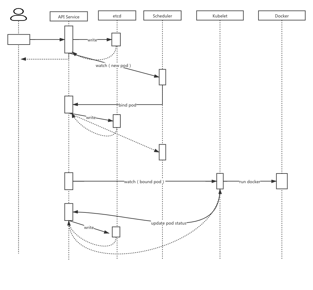 (1)用户提交创建Pod的请求,可以通过API Server的REST API ,也可用Kubectl命令行工具;