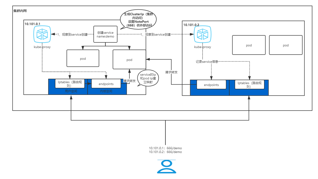 在ClusterIP基础上为Service在每台机器上绑定一个端口,这样就可以通过: NodePort来访问该服务。