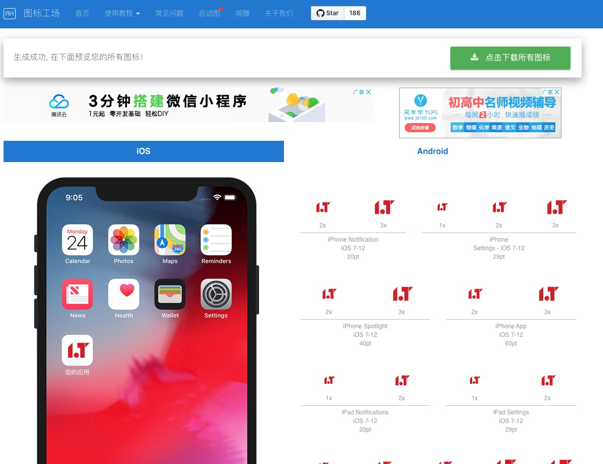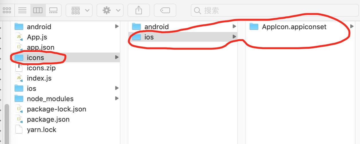 IOS: 用图标工场下载的文件,替换 ios/MyApp/Images.xcassets/AppIcon.appiconset 中的内容。如果不需要全部尺寸,可以用 XCode 打开项目,点击 Images.xcassets>AppIcon 拖入相应尺寸的图标