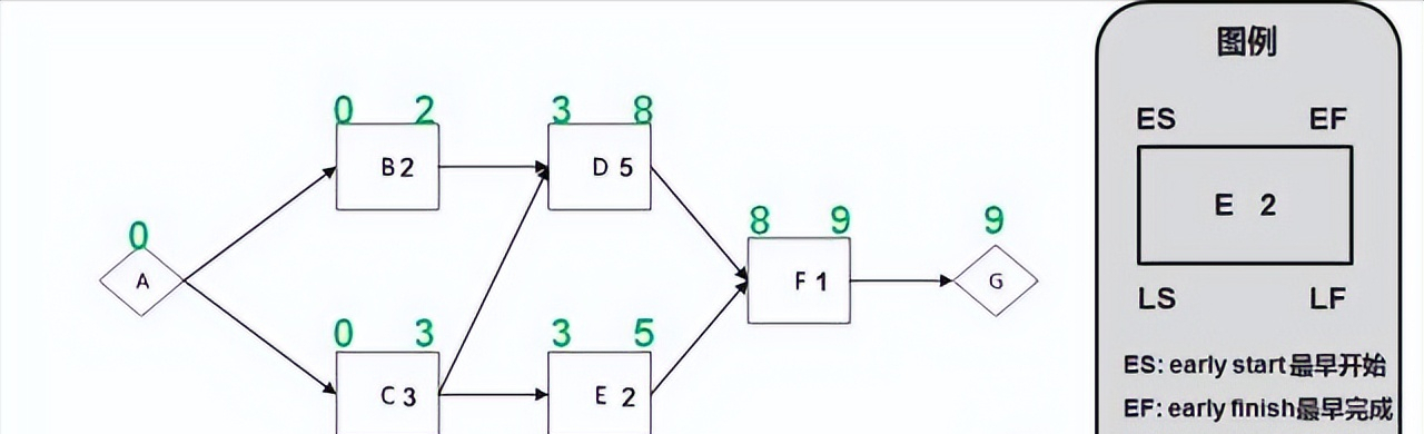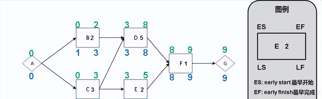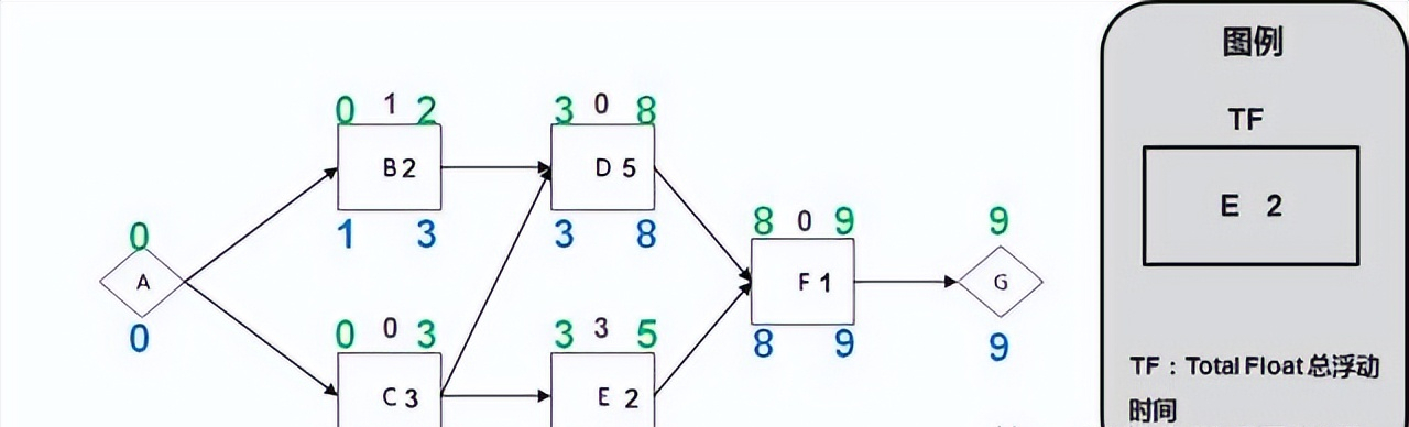 因此可以看出,ACDFG是项目的关键路径。也可以得出每个活动的总浮动时间,也就是TF=LS-ES=LF-EF。
