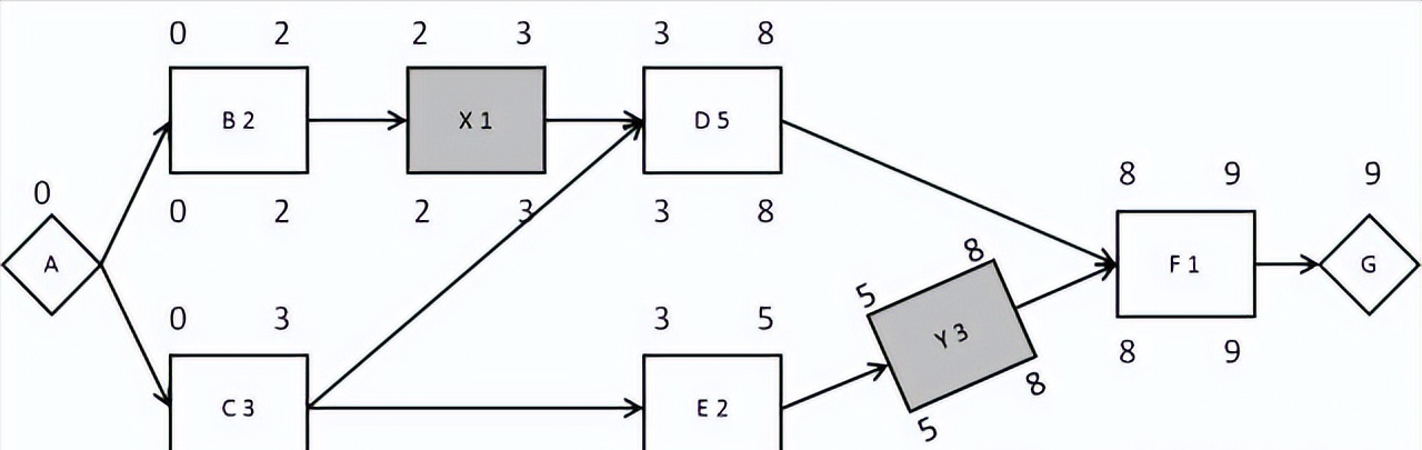 根据网络图,似乎导致项目会延期两天。但是此时由于Y活动是虚活动(缓冲buffer)也就是根本不存在的活动。看起来似乎虚活动Y 的工期被吃掉了两天。所以,F活动第8天开始是不会受到影响的,也就是说项目第9天完成是不会受到影响的。