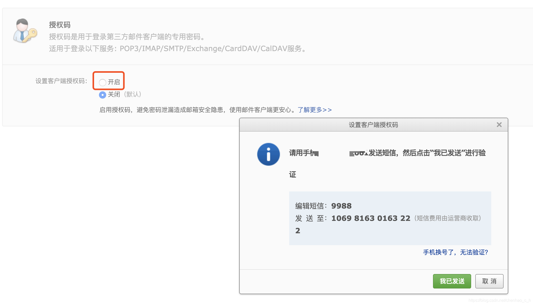 发送完成后填写授权码,自定义,记住该授权码,需要在代码中配置