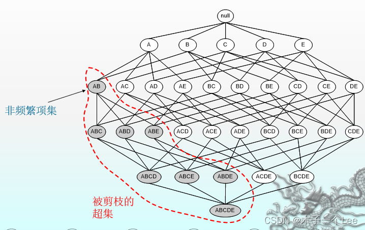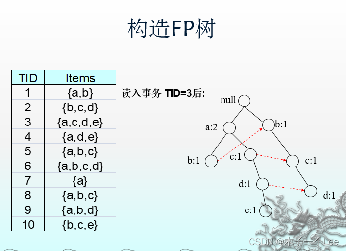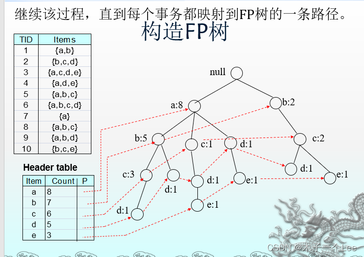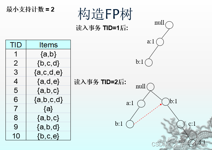 1. 支持度排序: 扫描一次数据集,确定每个项的支持度计数。丢弃非频繁项, 而将频繁项按照支持度的递减排序。 L = {a:8, b:7, c:6, d:5, e:3} 2. 构建 FP 树: 第二次扫描数据集,读入第一个事务 {a, b} 之后,创建标记为 a 和 b 的结点。然后形成null->a->b路径。该路径所有结点的频度计数为1。