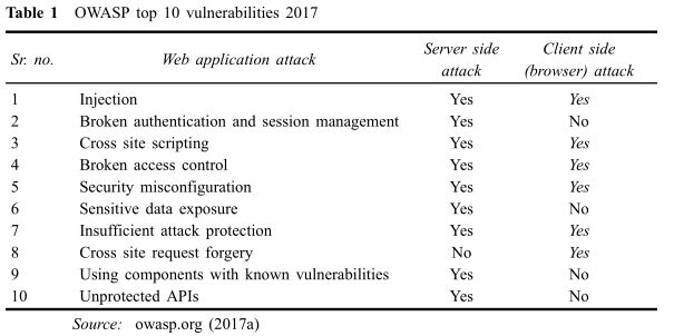攻击者已经将他们的重点从攻击服务器应用程序转移到客户端攻击,因为攻击客户端机器需要时间,获得的信息量大,而且不容易被发现。同时利用受害者的(被攻击的)个人电脑,攻击者将有可能控制其他系统。用户的系统、网络浏览器、用户系统和网络服务器之间的通信链接以及用户系统上运行的其他软件应用程序是客户端安全的组成部分。根据2016年卡巴斯基安全公告(Garnaev等人,2017),50%的攻击是基于浏览器的。表1显示了十大网络应用程序漏洞的列表,以及它们是否影响服务器和/或客户端系统。