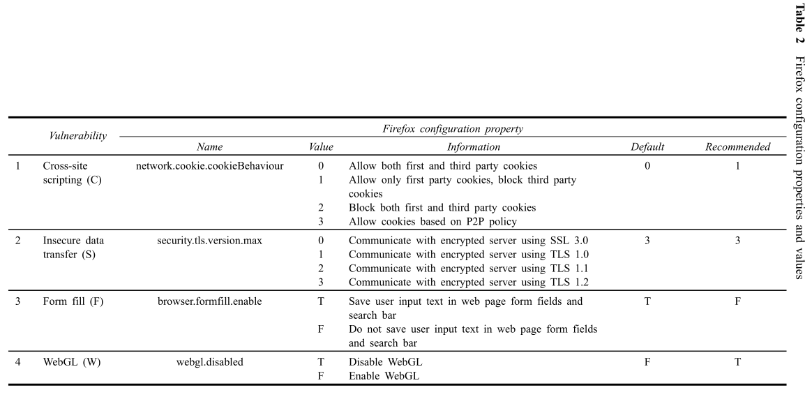 为防止WebGL攻击,需要禁用浏览器WebGL设置。表2给出了基于浏览器的漏洞和相应的Firefox配置属性及其可能的值。表2参考kb编制。kb.mozillazine.org (2017)和Pinto(2015)。