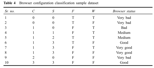 在本工作中,我们使用决策树算法J48来训练分类器。然后使用该分类器对输入浏览器配置进行类型转换。由64个样本组成的同一数据集用于训练J48分类器(样本见表4)。