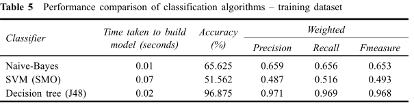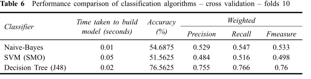 表6显示了朴素贝叶斯、支持向量机和J48分类器的测试阶段(十倍交叉验证)分类性能。