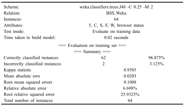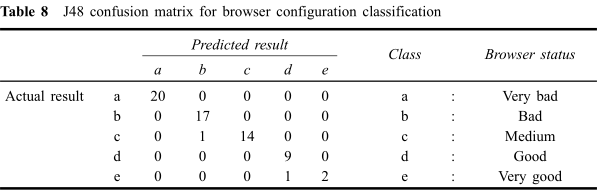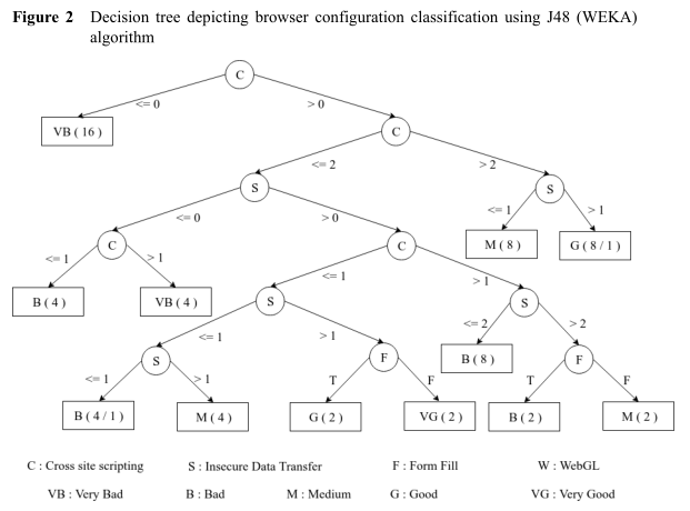 参考表5和表6,很明显,使用手动注释的64个浏览器配置样本,决策树(J48)算法(在训练阶段具有90%以上的准确度,在测试(交叉验证)阶段具有70%以上的准确度)在浏览器配置分类中优于朴素贝叶斯和支持向量机。因此,选择决策树(J48)分类器来开发一个框架,将浏览器配置划分为不同的安全级别。