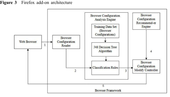 Firefox的原型插件框架已经开发出来,用于对浏览器配置进行分类。该框架用于自动化浏览器安全配置分析(分类)以及修改配置。浏览器配置分析是使用第4节中精心编制的12条规则完成的。该插件是用JavaScript编程的。建议的基于框架的Firefox插件架构模型如图3所示。