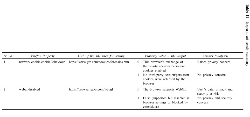为了进行实验,我们使用了在Ubuntu操作系统上运行的Firefox浏览器。ssllabs.com, freakattack.com, poodletest.com, browserleaks.com等网站提供了测试浏览器配置的设施。这些站点提供执行浏览器配置测试的功能,以检测基于cookie、SSL相关和基于WebGL的错误配置。浏览器测试是通过访问站点来执行的,无论是否使用建议的设置。实验设置如表10所示。