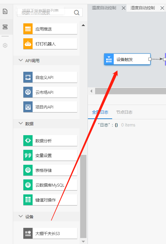 控件从界面的左侧拖到控制台,我选择了最底部,我的设备“千夫长S3”(是一个采集温湿度光照度、控制设备的物联网盒子)作为触发源。