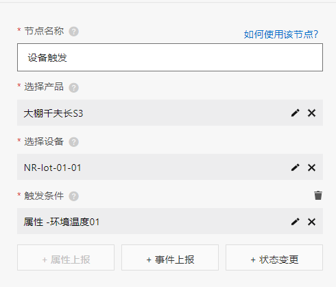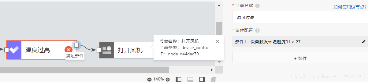 拉出一个条件判断的控件,命名为“温度过高”(方便理解,可以任意命名),条件判断的设置:条件配置,选择设备的某个属性,选择判断条件(<><=),输入阈值。