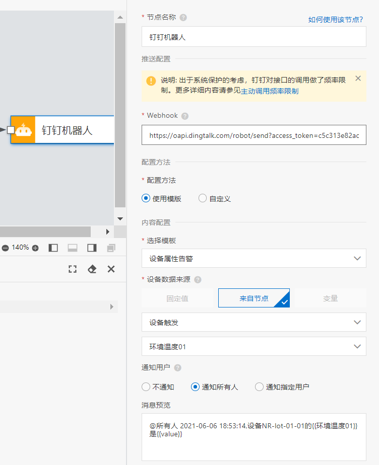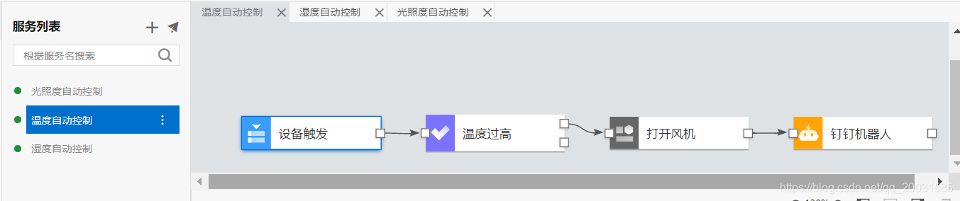 先说下大概的控制逻辑,设备上报数据->判断数据是否超过阈值->超过则打开调节设备->然后通知钉钉机器人在钉钉里推送一个报警消息。