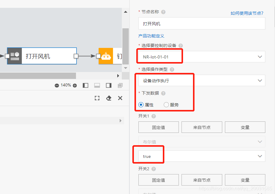 再把设备控件拉出来,名字改为动作的词“打开风机”,选择动作的设备和控制的开关号码。
