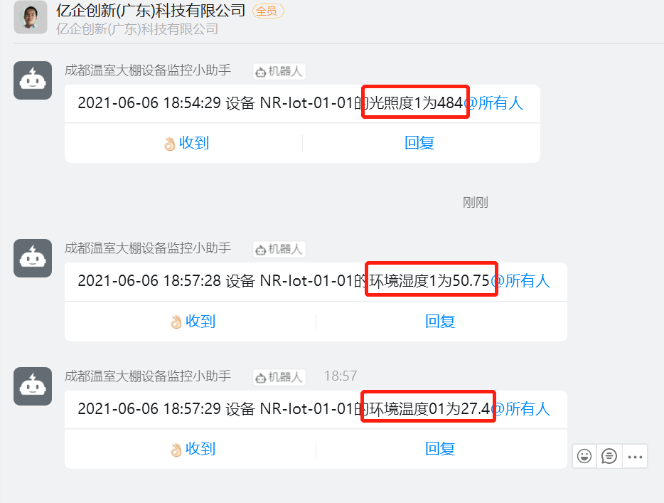 钉钉已经发出来消息,上一级的动作说明已经下发动作。至此,完成了自动控制的功能。