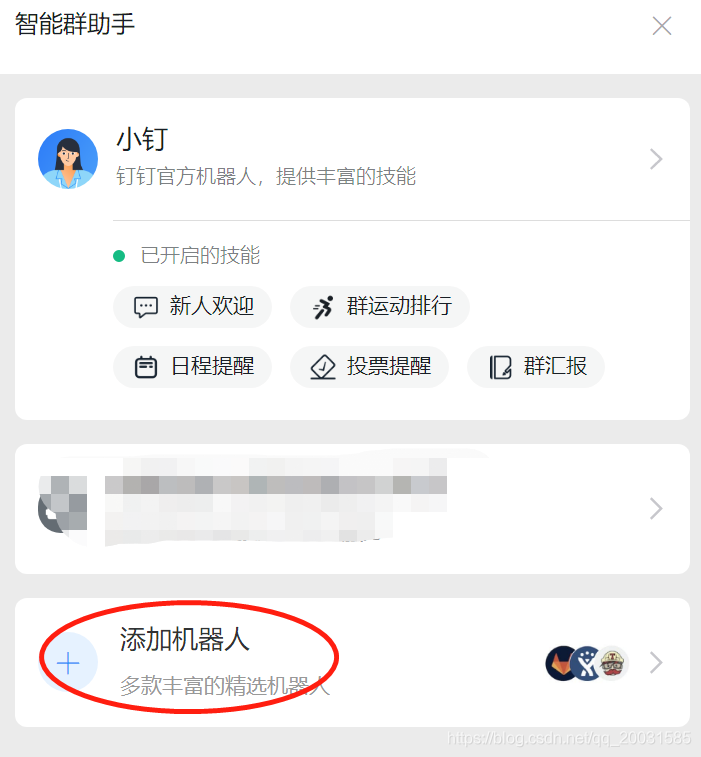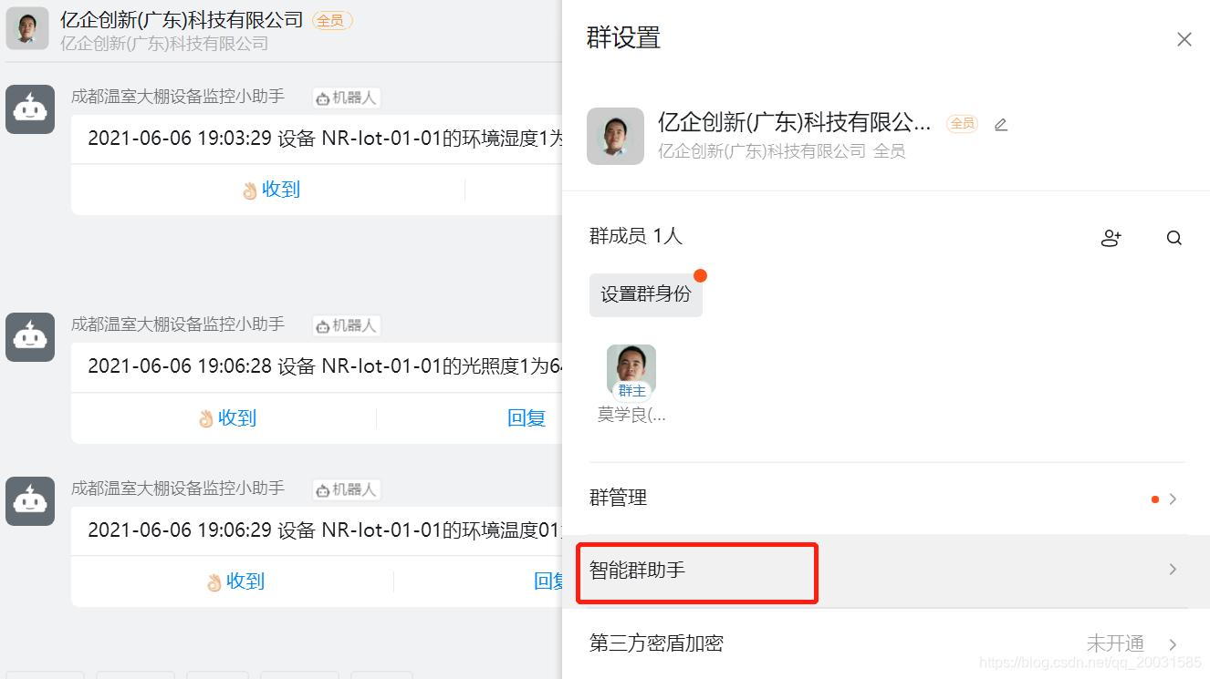 也就是刚才提到的,如何有一个钉钉机器人的webhook,我们打开一个钉钉群,点击齿轮打开配置,选择“智能群助手”。
