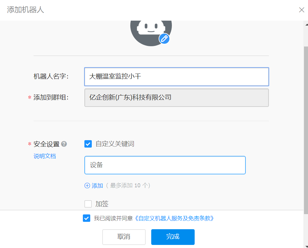 记得要勾选自定义关键词,写上“设备”,不要写别的,因为消息模板中要出现这个词,而消息模板用默认的就可以,自己编辑又要看语法规则。我之前写别的关键词,不能通过验证的。