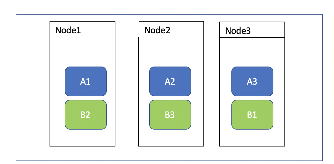 单个节点的容量是有限的,如果后期两个节点的容量不能够支持三个分片,那么另外启动一个节点就可以了,ES 会自动的重新规划分片,如下图:可以看到 A3 节点已经被自动的分配到 Node3 节点里面了,另外副本 B1 从 Node2 移动到 Node3 节点,B3 分片从 Node1 节点被分配到 Node2 节点。这里想一下,如果再启动一个节点呢?是的,再启动一个节点将不会对主分片起到任何作用,因为主分片不可以修改,只有三个,但是副本可以修改,能够起到扩容的作用。