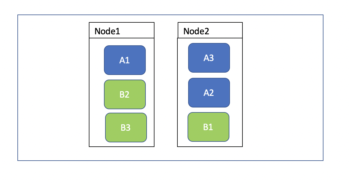 启动 2 个 ES 节点,配置分片个数为 3,副本个数为 1(每个分片有一个副本)。如下图,蓝色的代表主分片,绿色的是副本,仔细一点不难发现,分片与其副本不在同一个节点内。这是非常合理的,因为副本本来就是主分片的备胎,当主分片节点挂了,另外一个节点的副本将会充当主分片,如果它们在同一个节点内,副本将发挥不到作用。