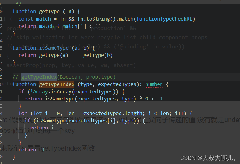 我们知道props的type属性是支持[String,Number,Boolean] 这样的数组形式的 所以函数里先判断 如果不是数组 且该type为Boolean 返回0否则返回-1 如果是数组则循环中的每一项 返回Boolean在数组的下标 如果没有Boolean则返回-1 我们就得到了booleanIndex 如果booleanIndex > -1则说明有Boolean类型的声明 如果propsData不存在该key也就是父组件没有向当前组件传值且当前组件该key的配置项没有设置默认值 则value = false 如果父向当前组件传了一个空字符串 key的-形式 然后获取String的下标 如果不存在或Boolean在String前 则value=true 如果父组件没有向当前组件传值且没有type声明为Boolean 则value等于默认值无default 则为undefined