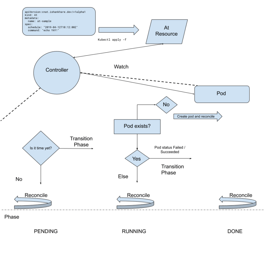 - 对于上述需求,很适合使用Operator 模式来解决,这里有官方对Operator的介绍:https://kubernetes.io/zh/docs/concepts/extend-kubernetes/operator/ ,Operator模式的执行流程如下图所示:
