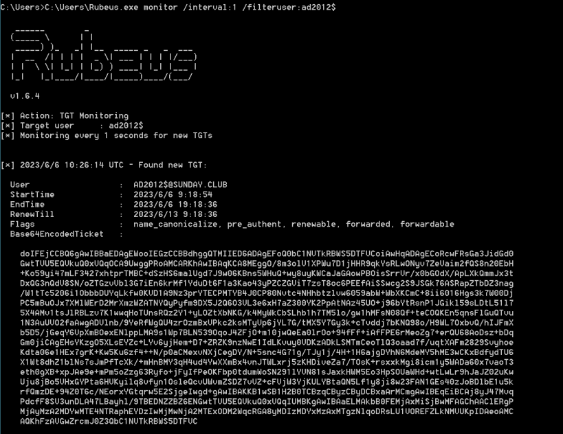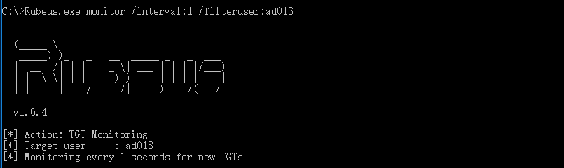 Rubeus.exe monitor /interval:1 /filteruser:ad01$