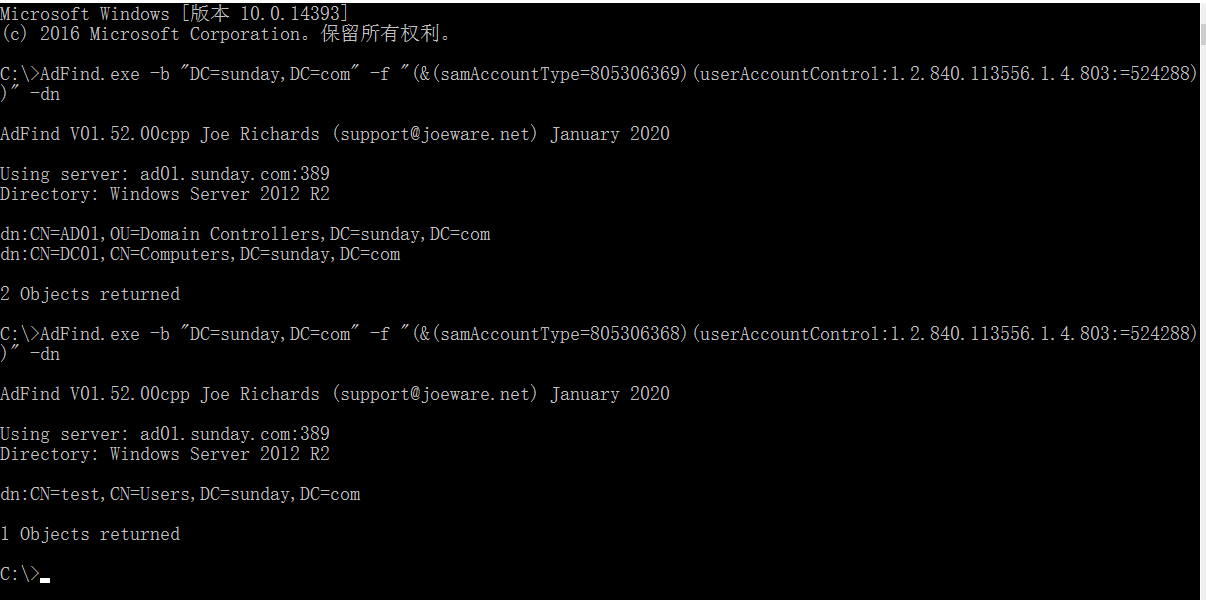 AdFind.exe -b "DC=sunday,DC=com" -f "(&(samAccountType=805306369)(userAccountControl:1.2.840.113556.1.4.803:=524288))" -dnAdFind.exe -b "DC=sunday,DC=com" -f "(&(samAccountType=805306368)(userAccountControl:1.2.840.113556.1.4.803:=524288))" -dn