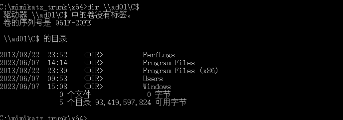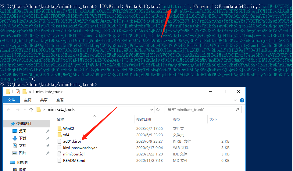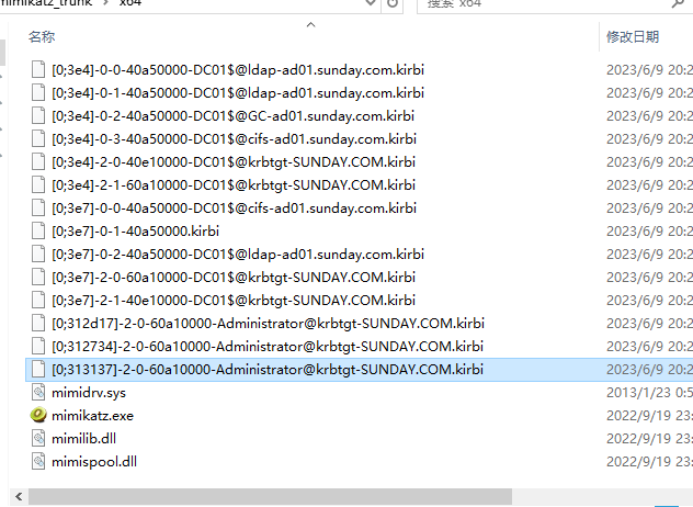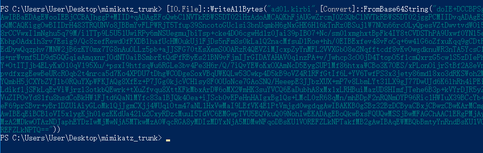 - 执行命令后,会在当前目录下生成ad01kirbi票据,,放在mimikatz.exe目录下,使用mimikatz导入票据即可。