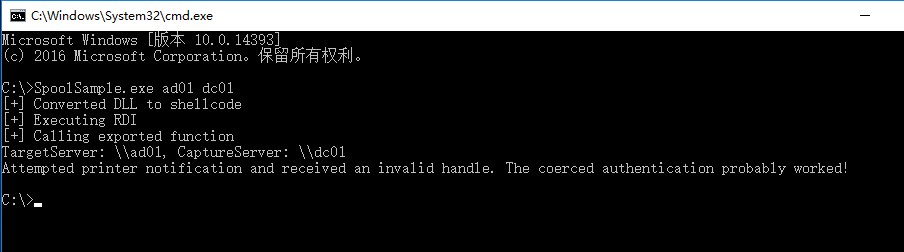 - 再利用SpoolSample强制域控打印机回连,获得域控机器账户的TGT,需在域用户进程上执行,