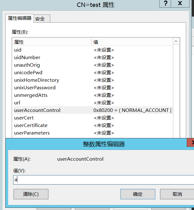 这时候 test 用户就拥有委派的属性,可以将其设置为非约束性委派