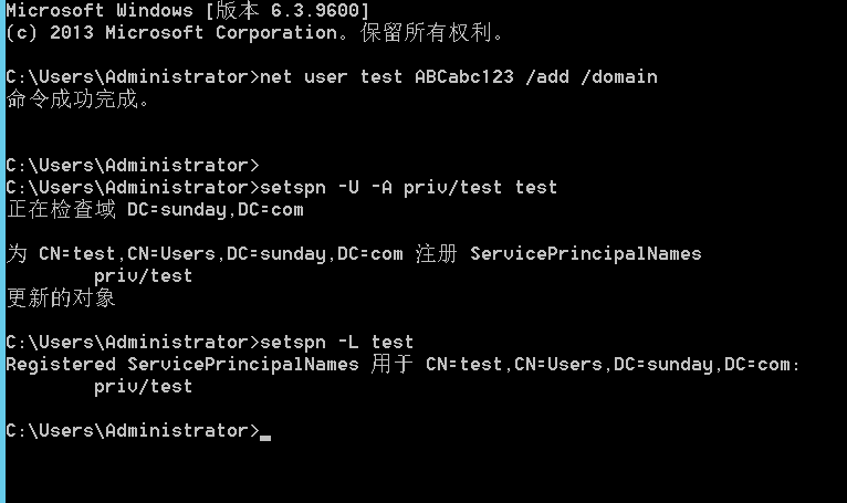 服务账号的非约束性委派配置,可以先创建一个普通用户testnet user test ABCabc123 /add /domain