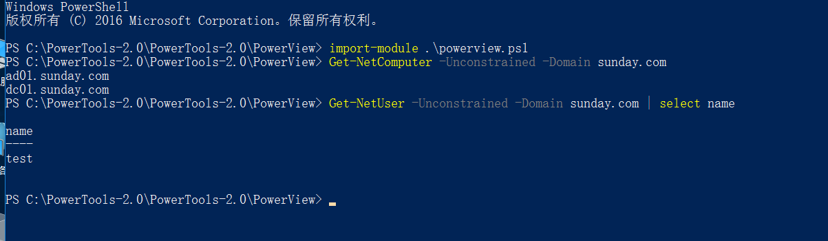Get-NetComputer -Unconstrained -Domain sunday.com# 查询域内非约束性委派的服务账号