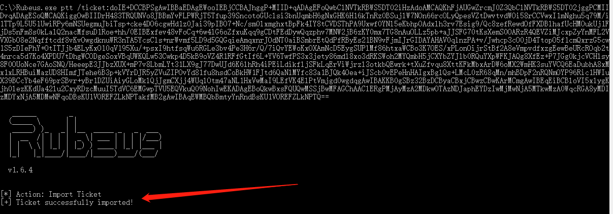 - Rubeus 监听到base64编码的tgt ,该TGT是base64的,有两种方法可以导入到内存中。此处base64字符串导入票据需要进行处理,去除空格和换行符\n