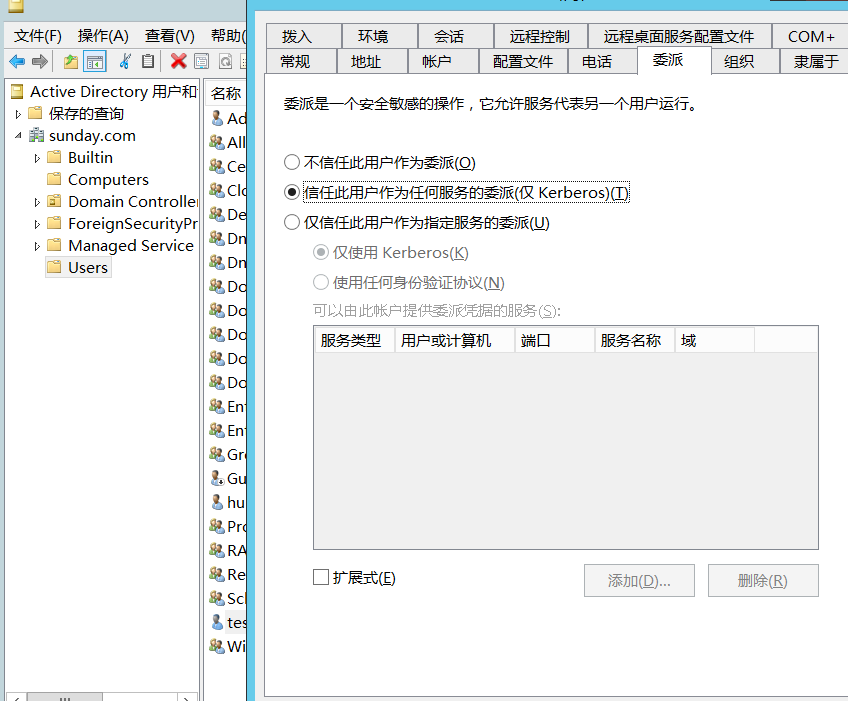 委派是一种域内应用模式,是指将域内用户账户的权限委派给服务账号,服务账号因此能以用户的身份在域内展开活动(请求新的服务等)。