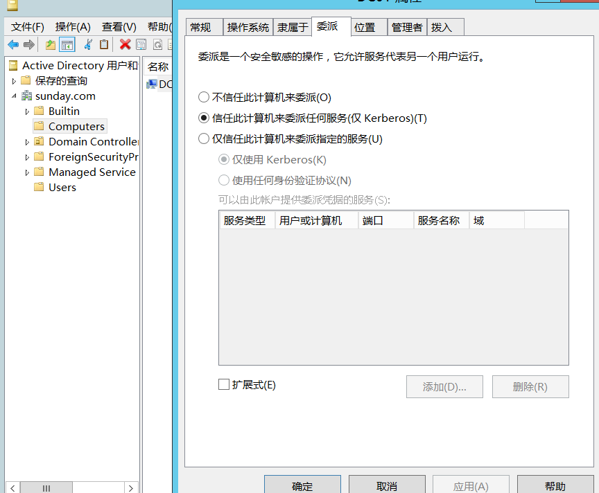 计算机用户的非约束性委派配置:控制面板\系统和安全\管理工具\Active Directory 用户和计算机(%SystemRoot%\system32\dsa.msc)---> 域名/Computers/名称/属性 ---> 委派 ---> 信任此计算机来委派任何服务 (仅 Kerberos)(T)