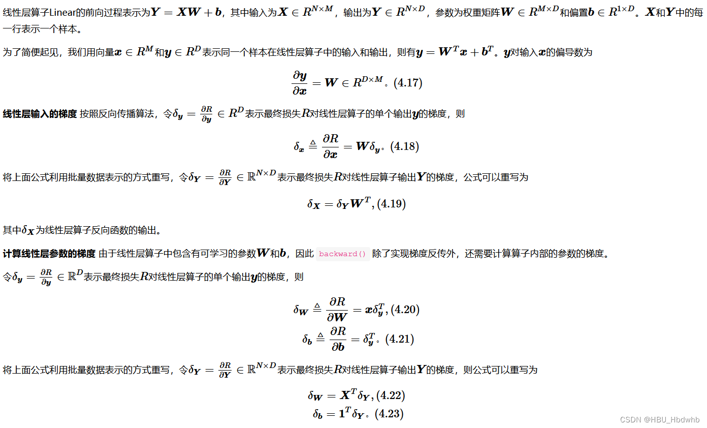 class Linear(Op):def __init__(self, input_size, output_size, name, weight_init=torch.normal, bias_init=torch.zeros):self.params = {}self.params['W'] = weight_init(0,1,size=[input_size, output_size])self.params['b'] = bias_init(size=[1, output_size])self.inputs = Noneself.grads = {}self.name = namedef forward(self, inputs):self.inputs = inputsoutputs = torch.matmul(self.inputs, self.params['W']) + self.params['b']return outputsdef backward(self, grads):"""输入:- grads:损失函数对当前层输出的导数输出:- 损失函数对当前层输入的导数"""self.grads['W'] = torch.matmul(self.inputs.T, grads)self.grads['b'] = torch.sum(grads, axis=0)# 线性层输入的梯度return torch.matmul(grads, self.params['W'].T)