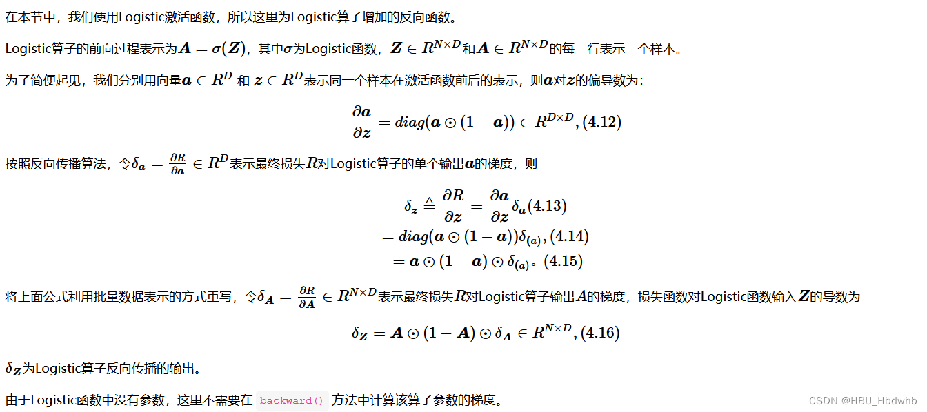 class Logistic(Op):def __init__(self):self.inputs = Noneself.outputs = Nonedef forward(self, inputs):"""输入:- inputs: shape=[N,D]输出:- outputs:shape=[N,D]"""outputs = 1.0 / (1.0 + torch.exp(-inputs))self.outputs = outputsreturn outputs