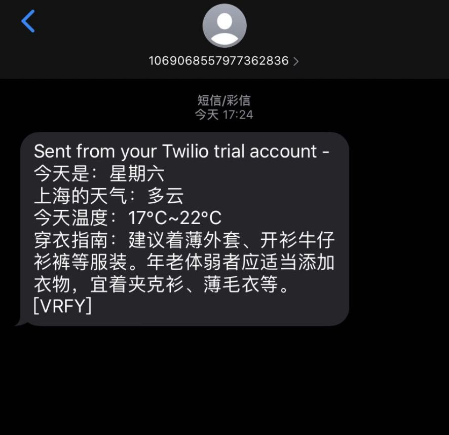 然后我们把之前的天气信息用短信发出去,当然你可以发送其他信息。这里我为了偷懒,用之前的天气信息。