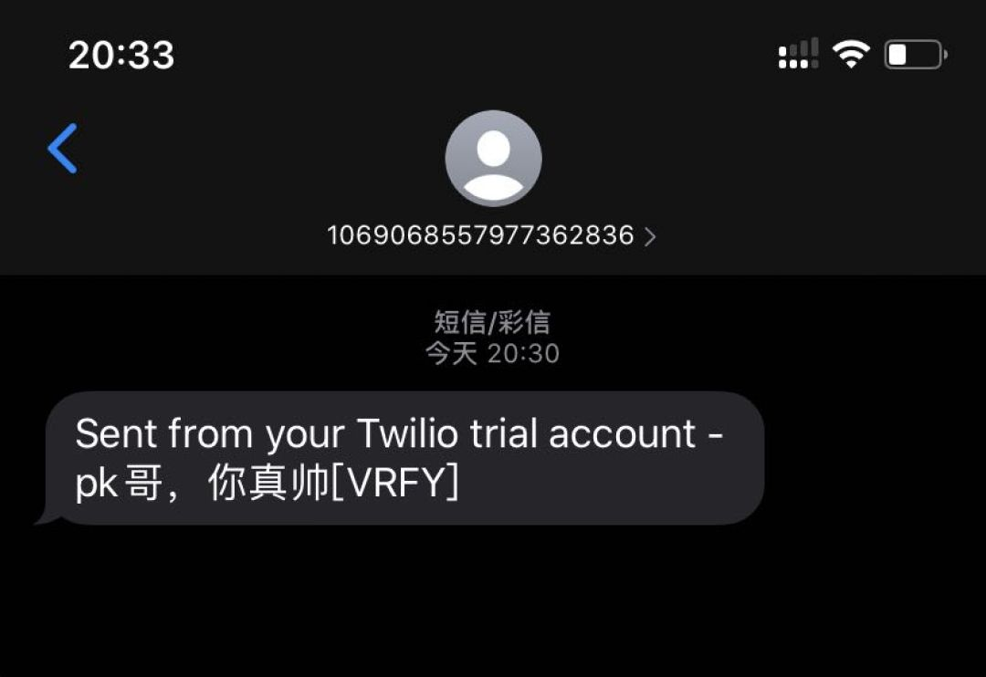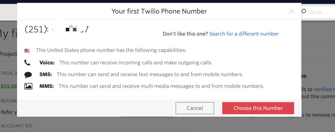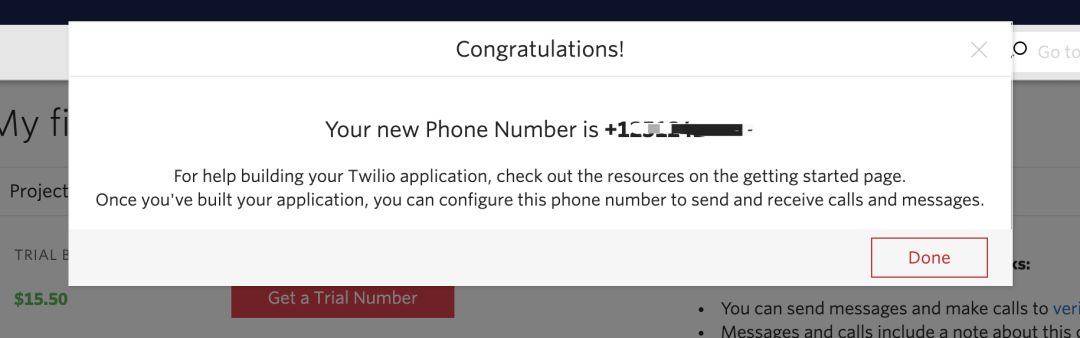 点击确定后就会出现成功的页面,显示 Twilio 提供的号码,这个号码就是用来发送短信的。