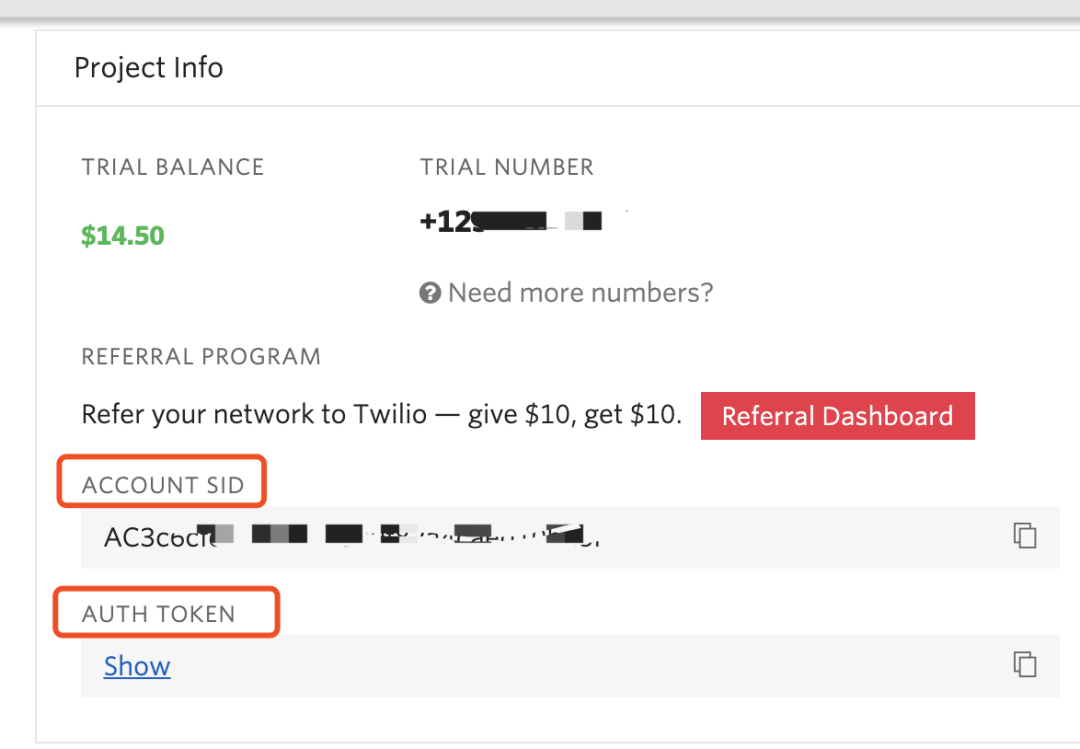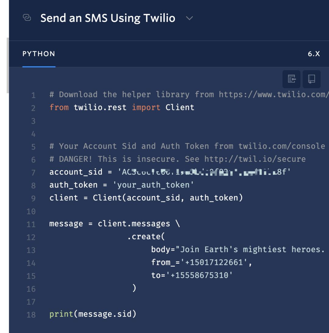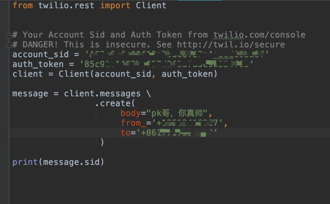 我们直接拿来用即可,把代码中 account_sid 和 auth_token 替换成自己的,这个两个值在刚才显示号码那个页面。