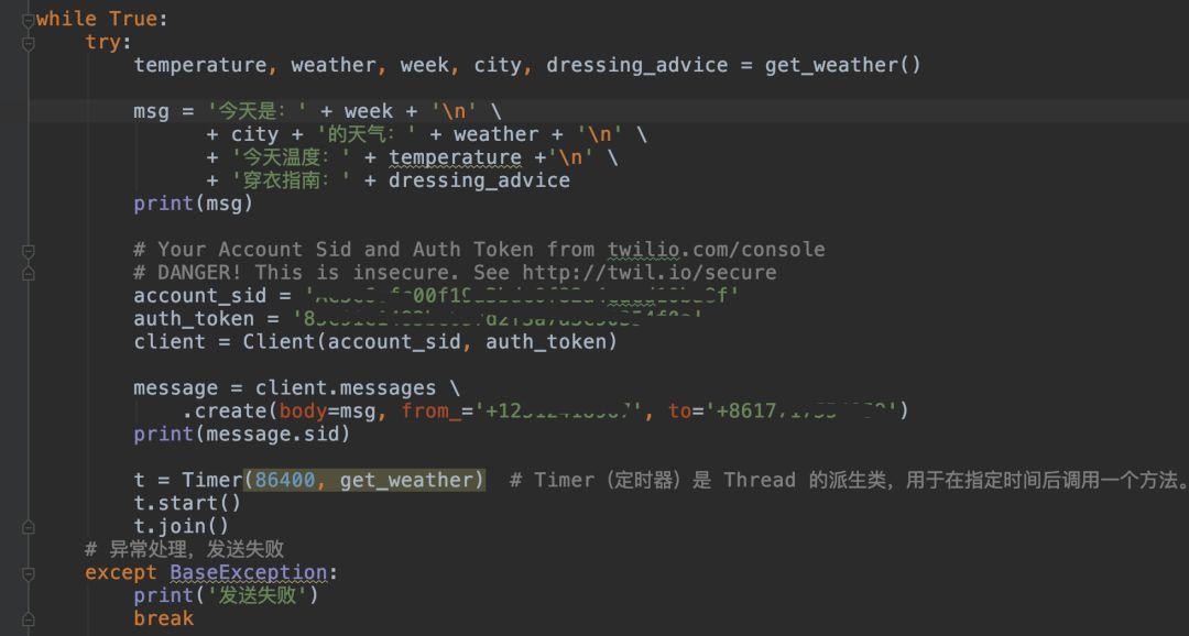把刚才发送短信的内容替换成天气接口返回的信息 msg,定时操作的代码和之前一样。